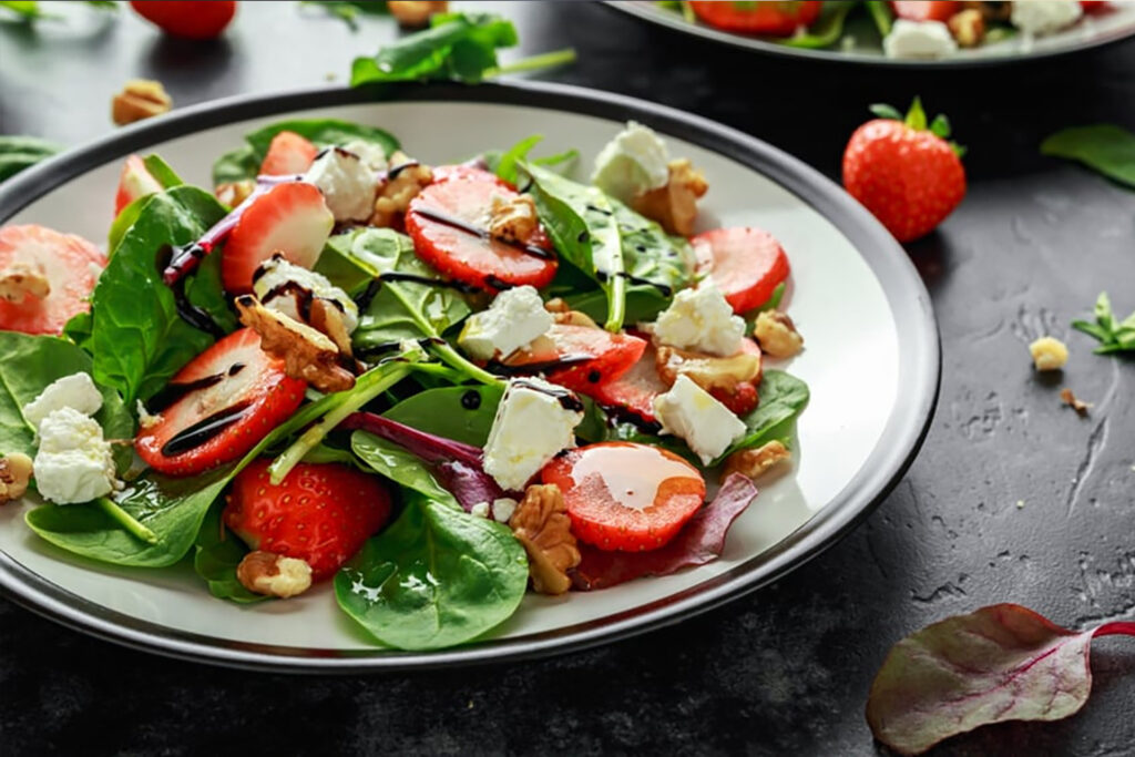 - Mix and toss spinach, strawberries and cheese.